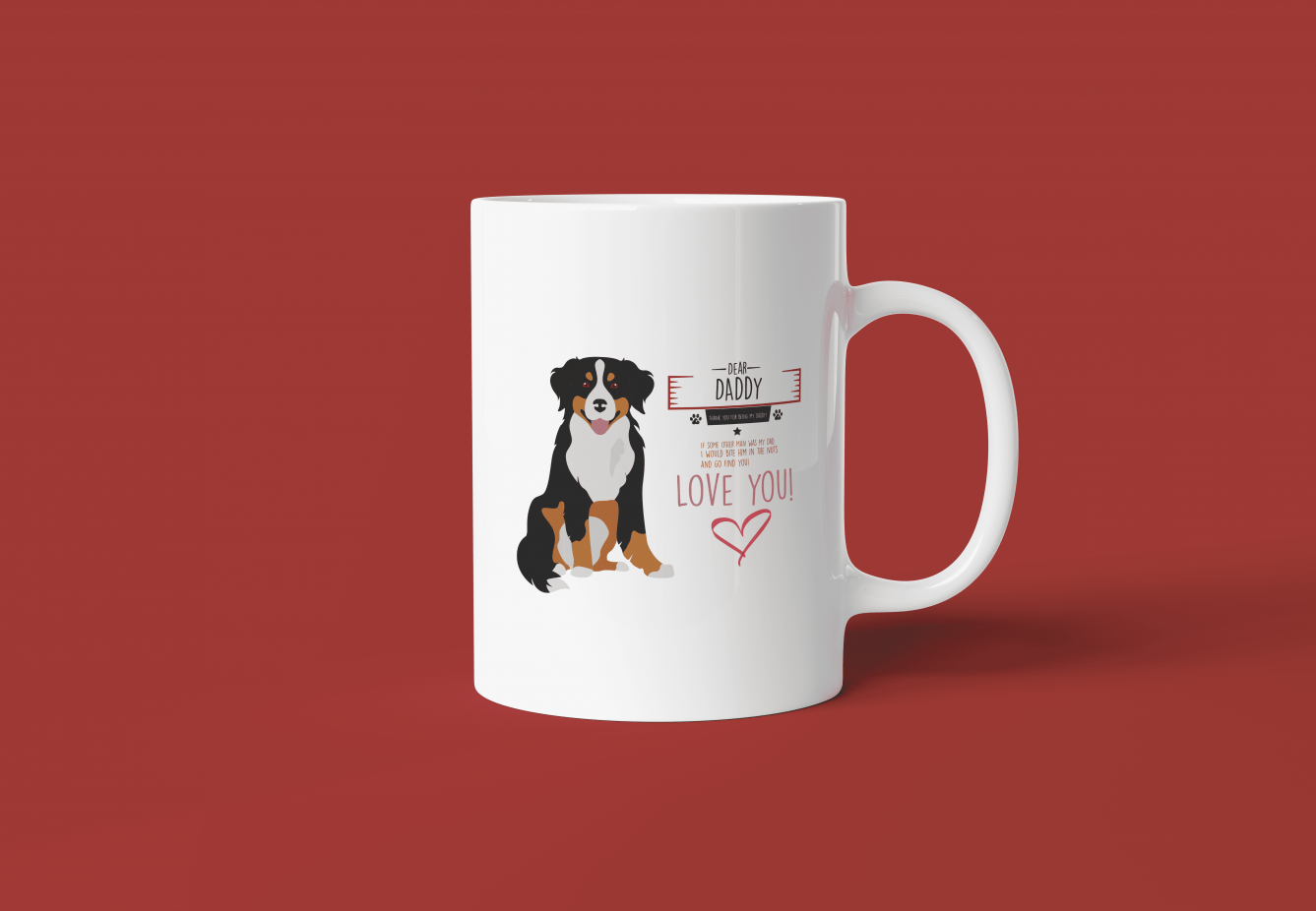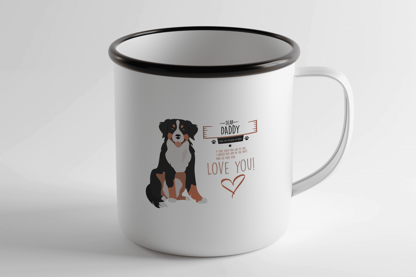 Kopp med berner sennenhund-motiv. Koppen har en glad Berner sennenhund valp med teksten «Dear daddy! Thank you for being my daddy! If some other man was my dad, I would bite him in the nuts and go find out! LOVE YOU!»