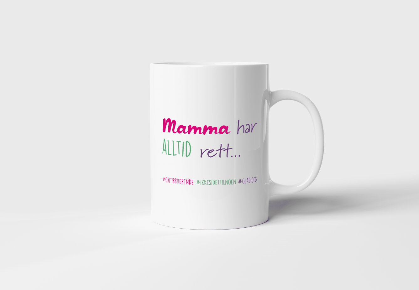 Mamma har alltid rett er en morsom kopp med tekst som sier «Mamma har alltid rett… #dritirriterende #ikkesidettilnoen #gladideg».